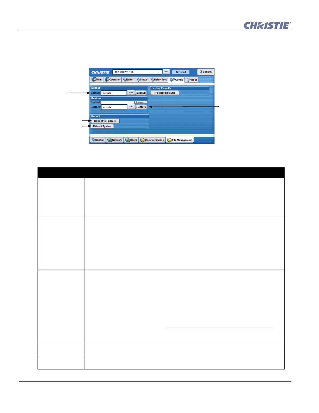 Factory Defaults Click to restore factory defaults for Christie ACT’s scripts and users. Click the appropriate radio button