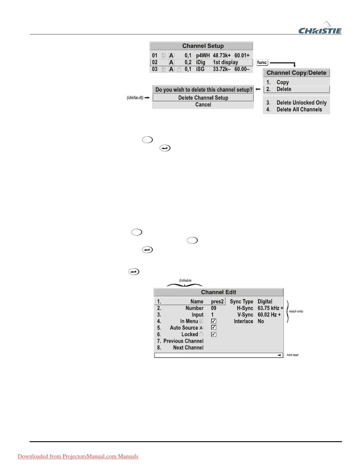 to go to the Channel Copy/Delete submenu. Select “Delete Unlocked