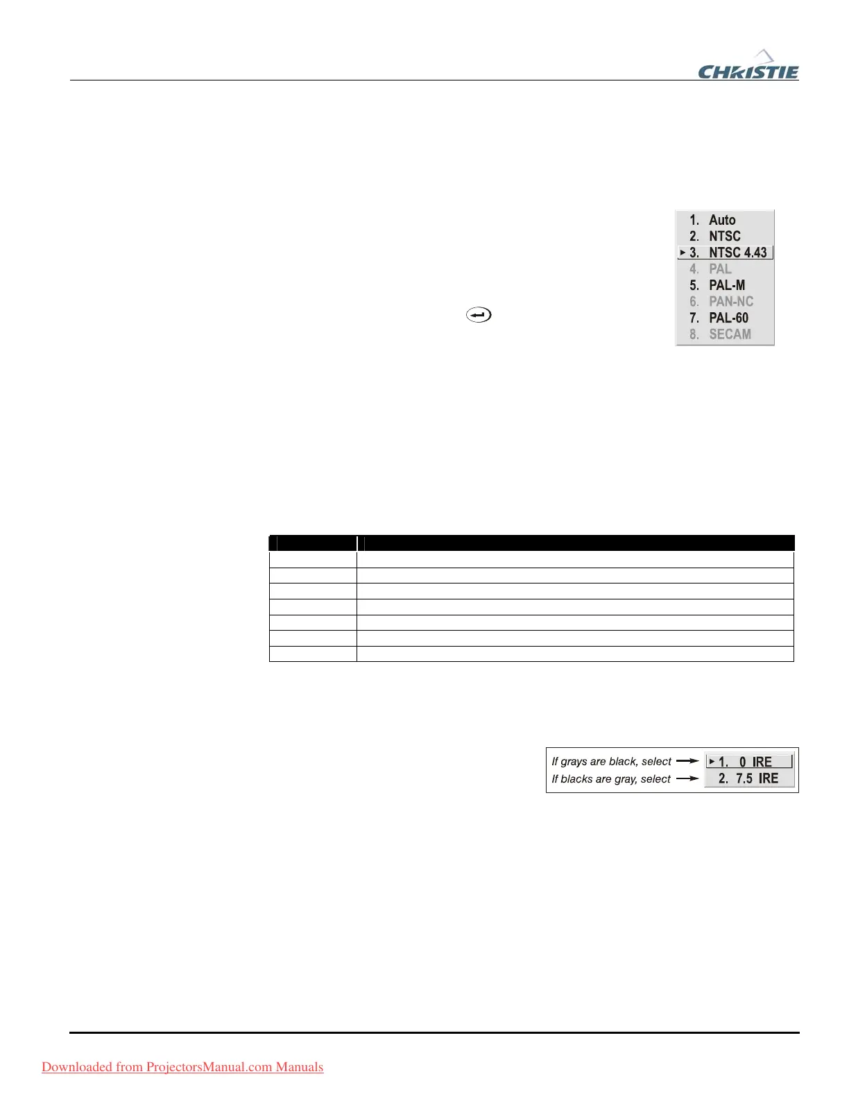 brightness = 50, choose “0 IRE”. If black appears excessively elevated, use “7.5 IRE”.