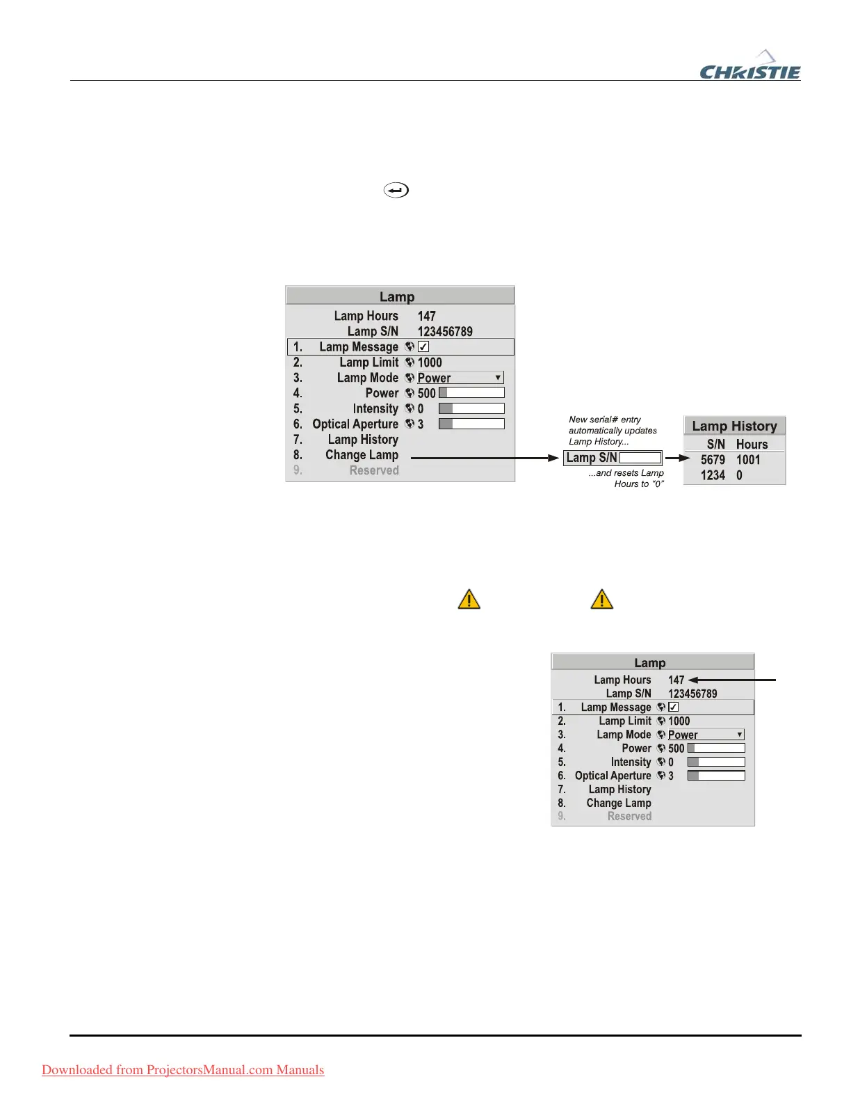 number will be added to the Lamp History menu and the Lamp Hours timer will reset