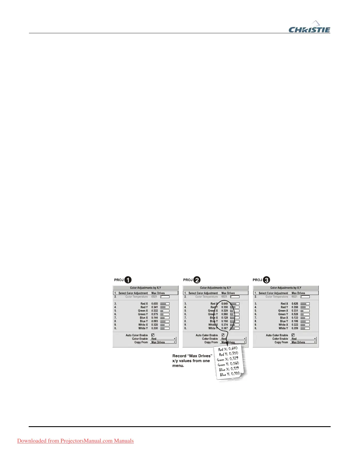 4. Display the Color Adjustments by X,Y menus for all projectors. Each menu shows