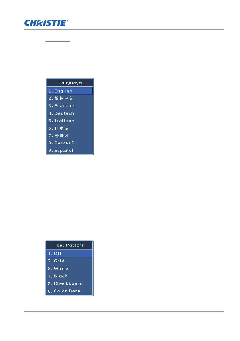 Christie DWU775-E - Language Selection Menu; Test Pattern Menu Options