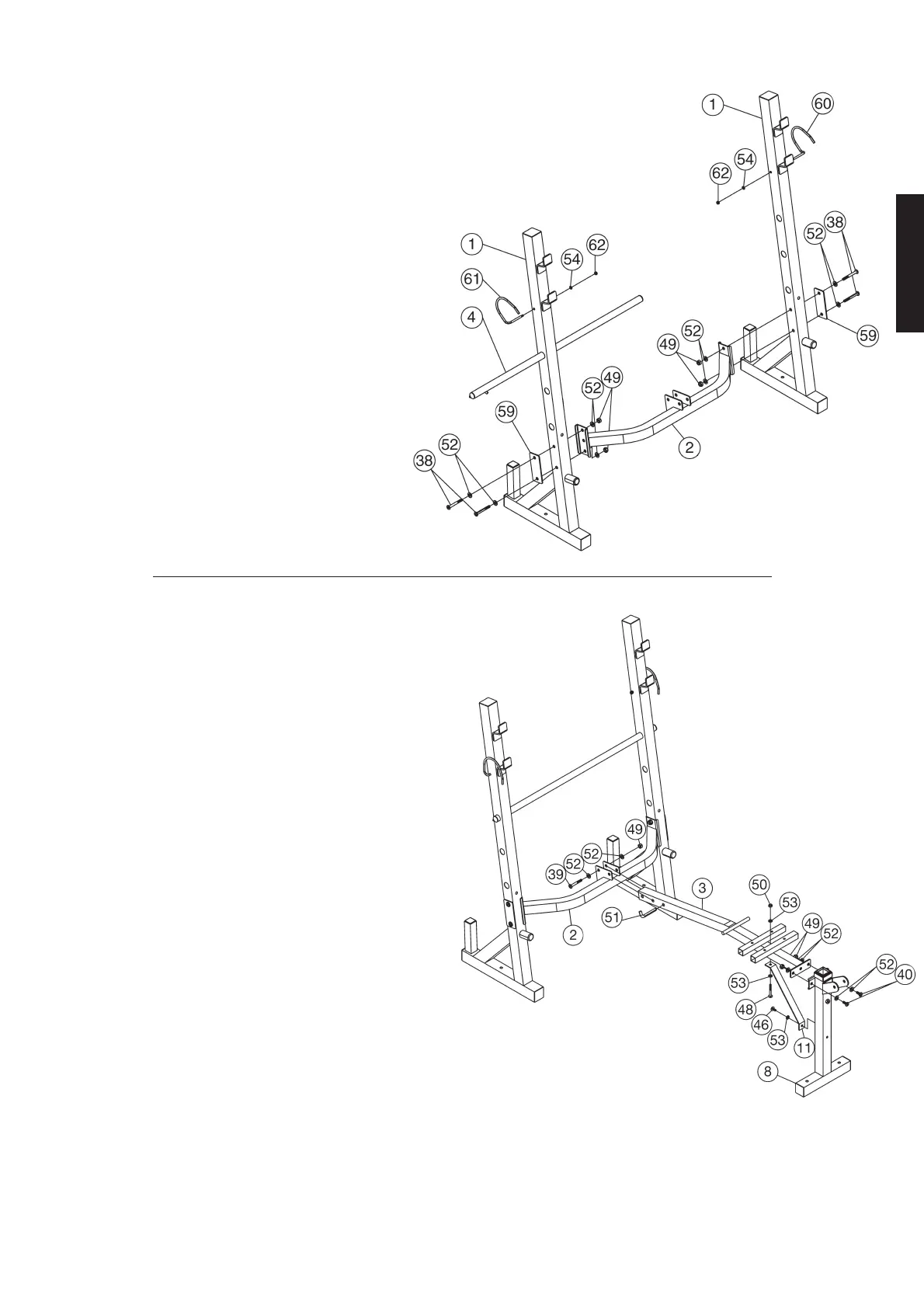 1. Place the crossbar (11) with the screws (46) + (48), the washers (53)