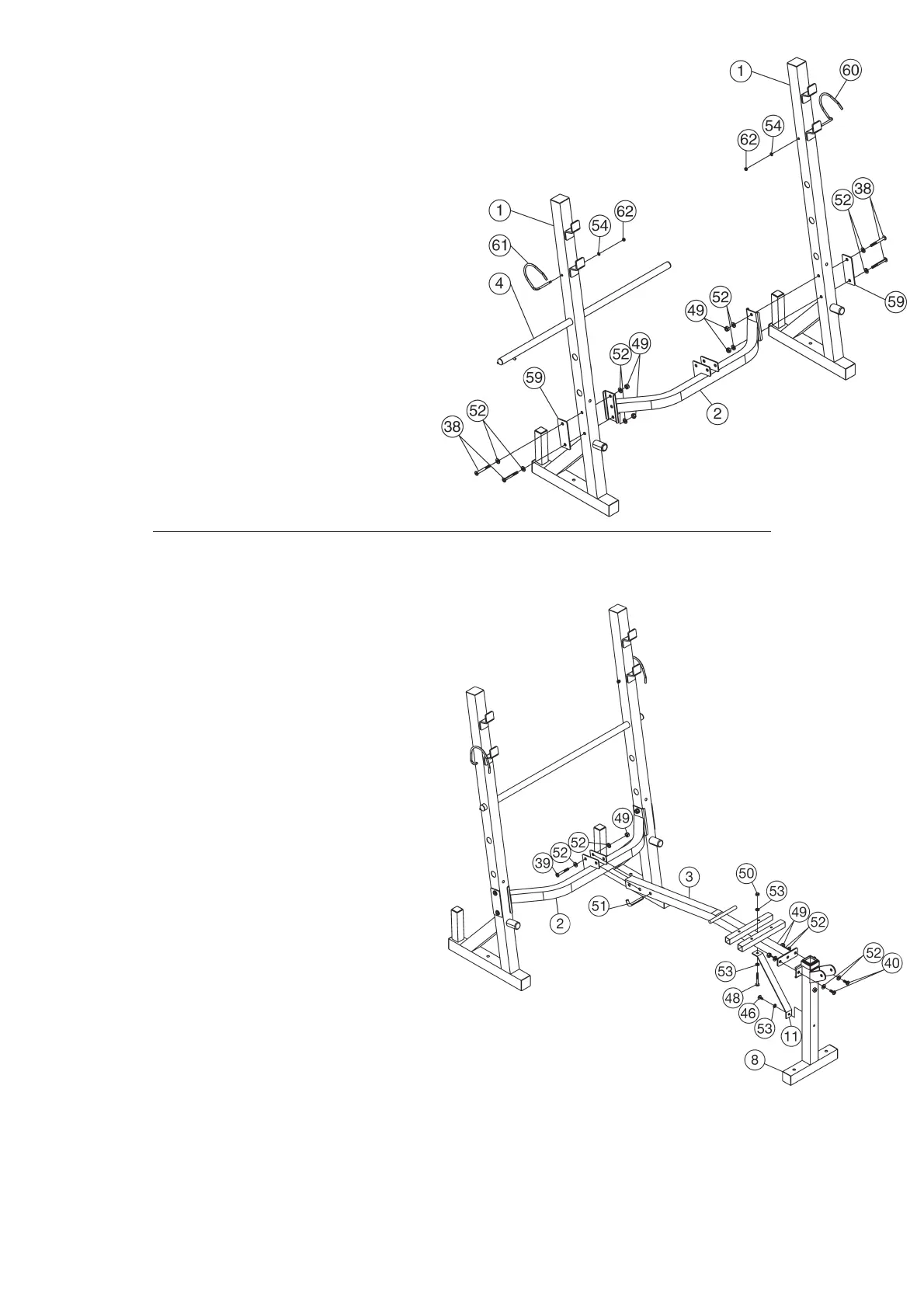 1. Préparez les pieds arrière (1), les cadres transversaux (2), les vis (38), les