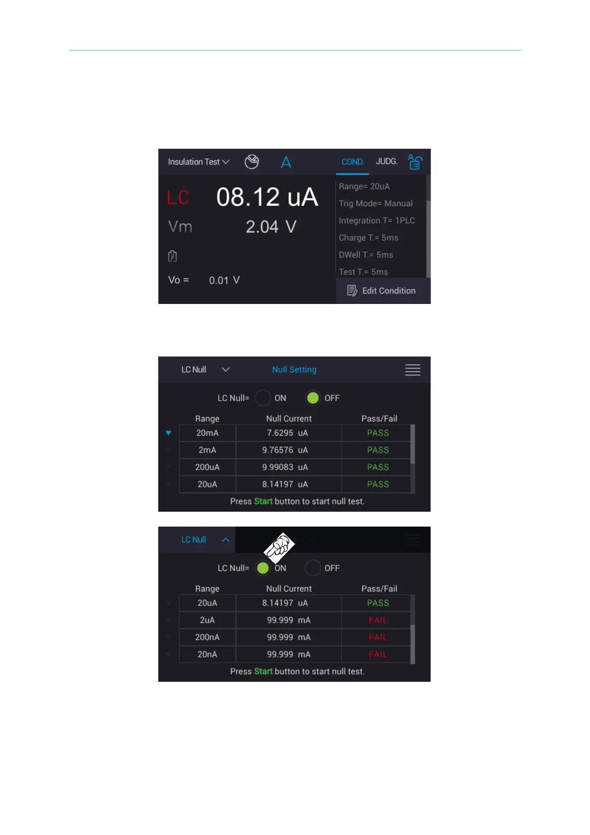 Perform LC Null to do various ranges leakage current reading on overall circuit, measurement