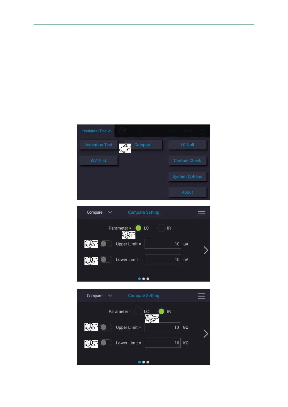 Compare is mainly used for setting insulation resistance or leakage current compare condition,