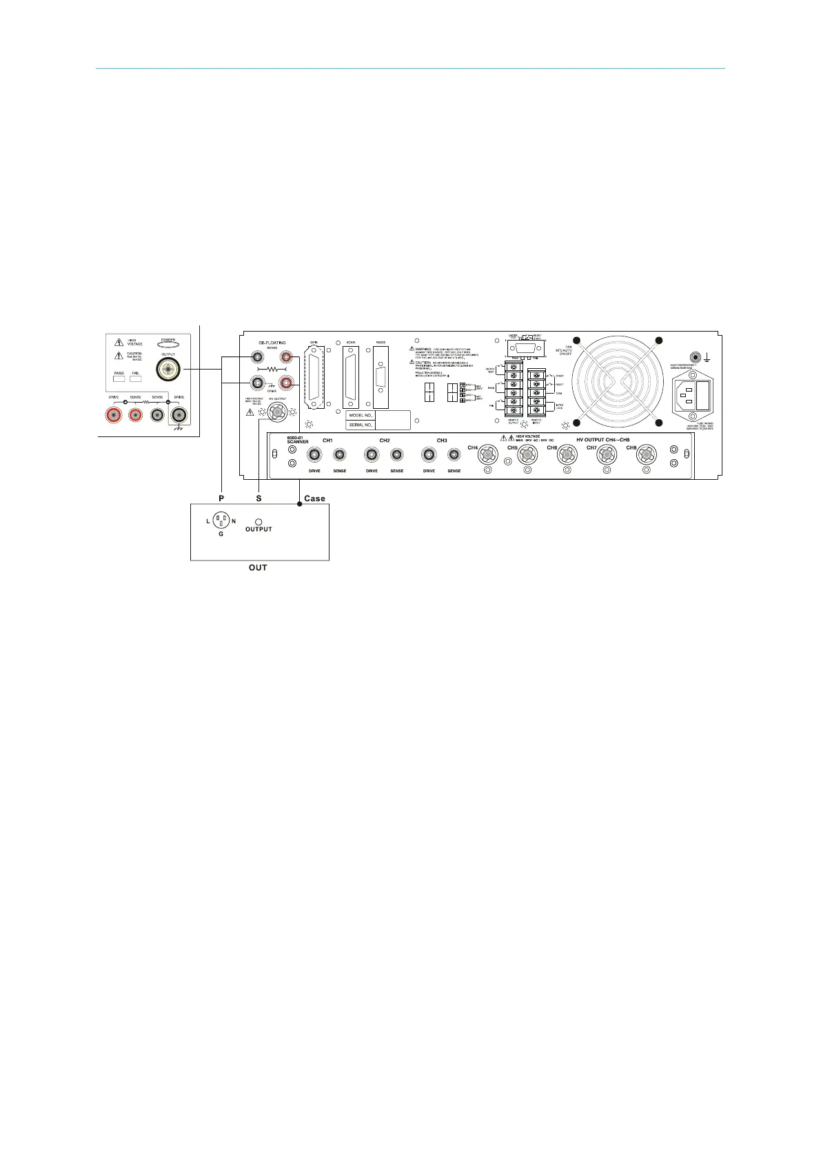 on the front panel and HV OUT (Low) on the rear panel. Connect the low potential test
