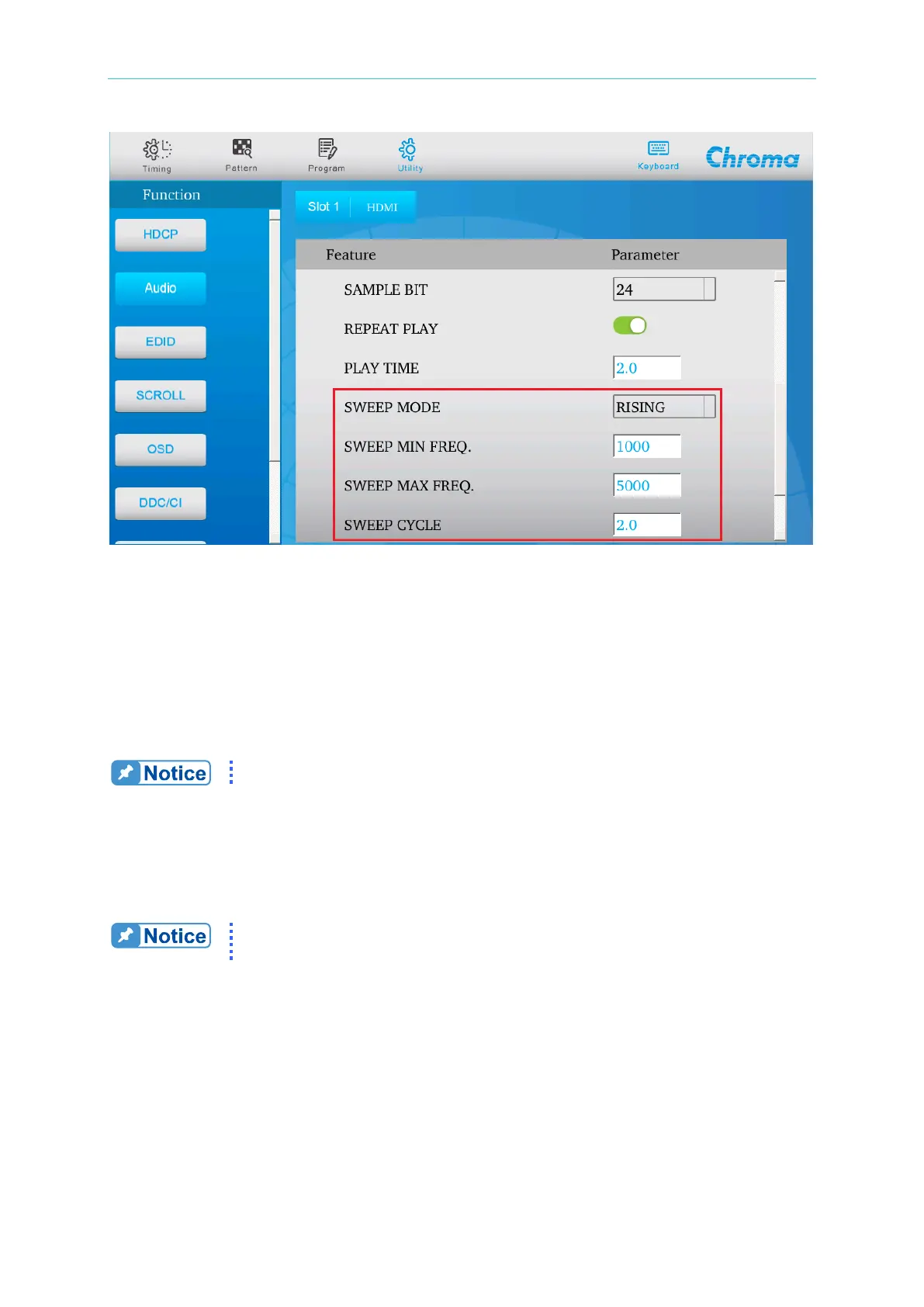 SWEEP MAX FREQ.: It edits the maximum frequency of Audio SWEEP ranged from 10