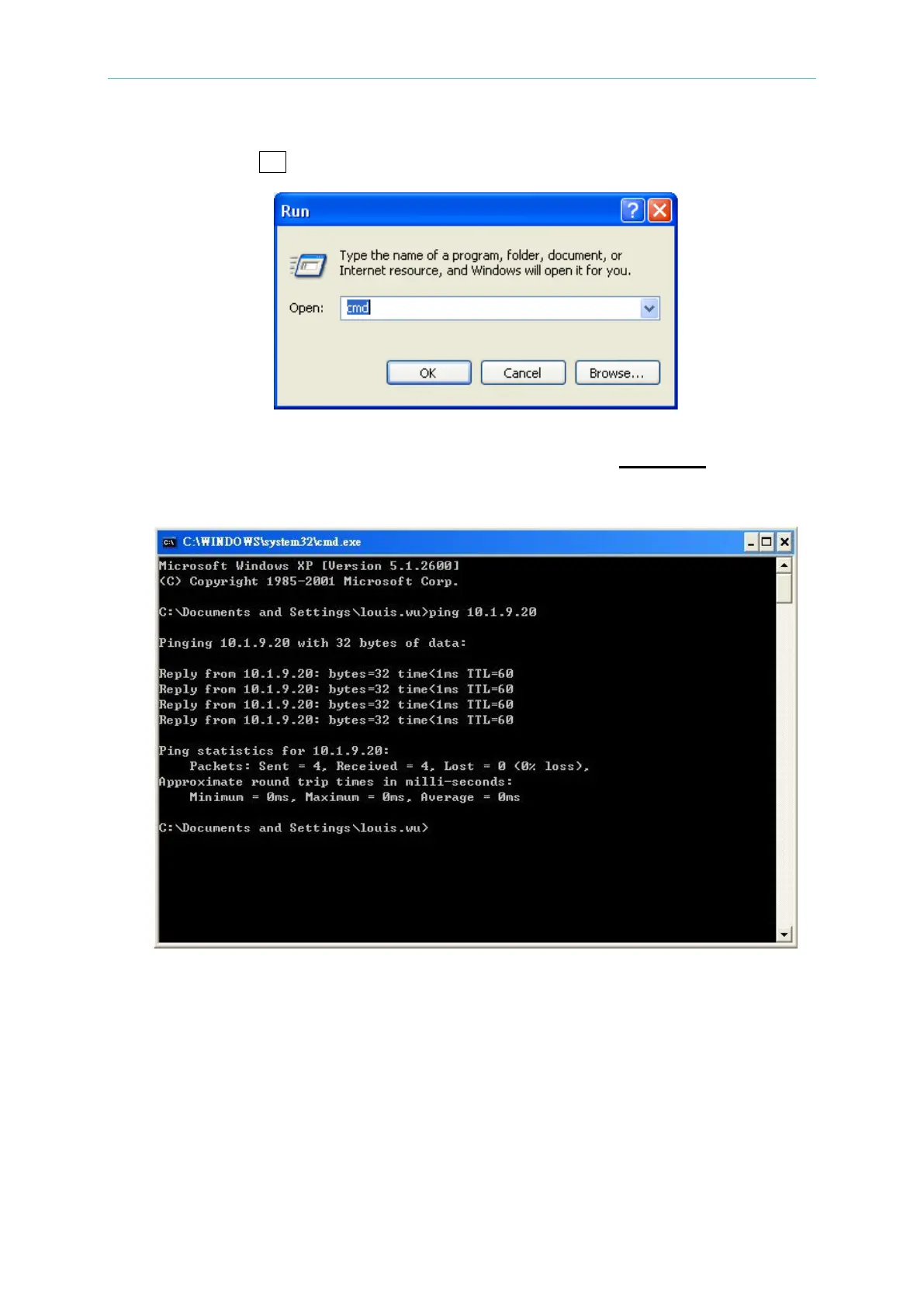 A window of MS-DOS operation environment will open. Input āping IP addressā such as ping