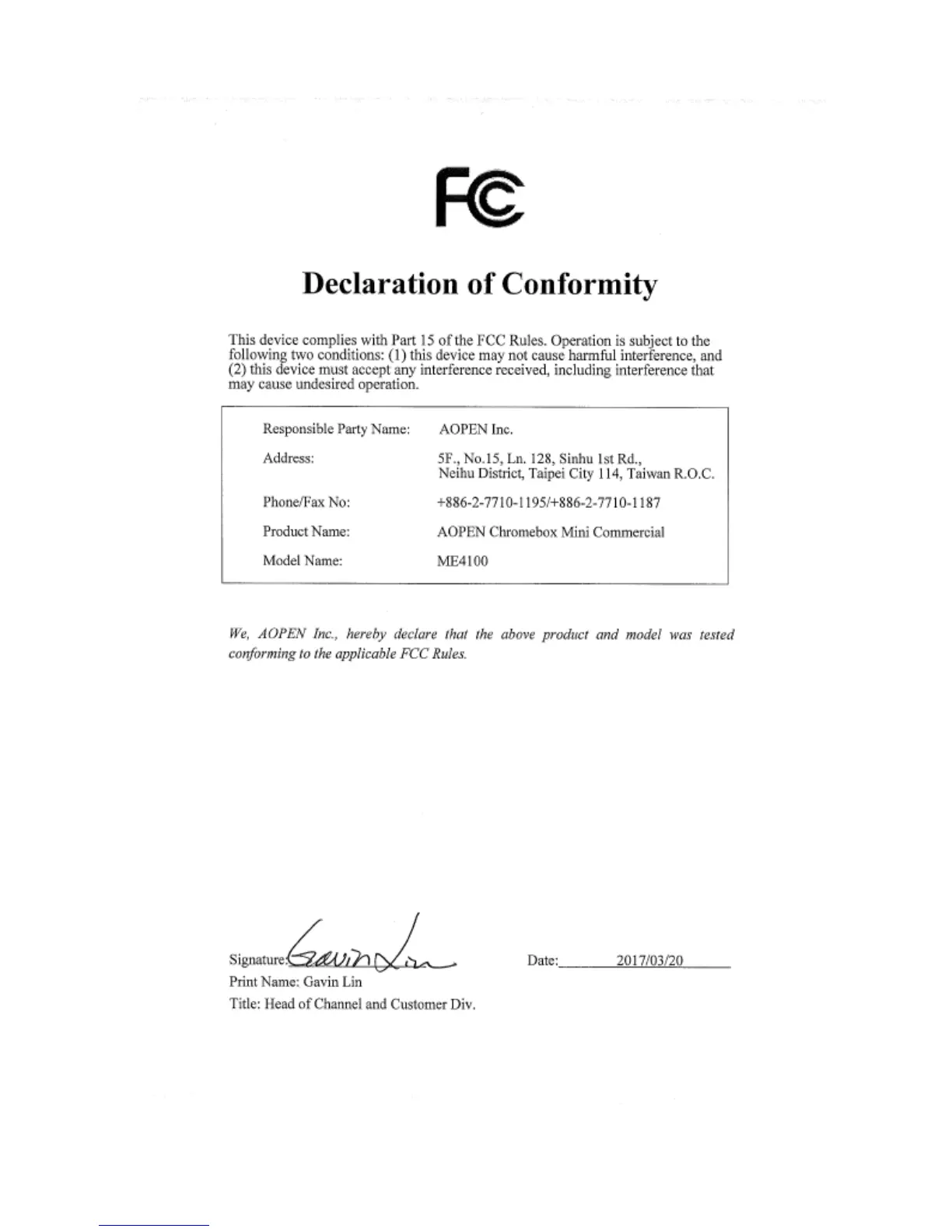 Chromebox ME4100 - FCC Compliance