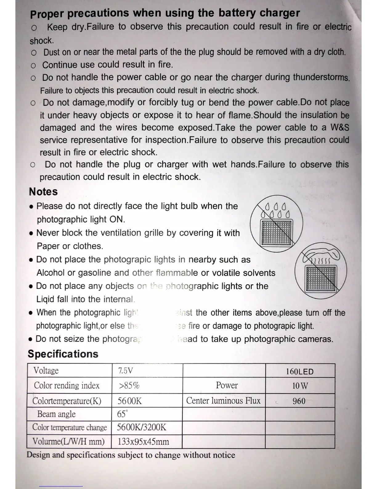 Chromo 160LED - Battery Charger Precautions; Charger Safety Guidelines; Usage Notes; Specifications