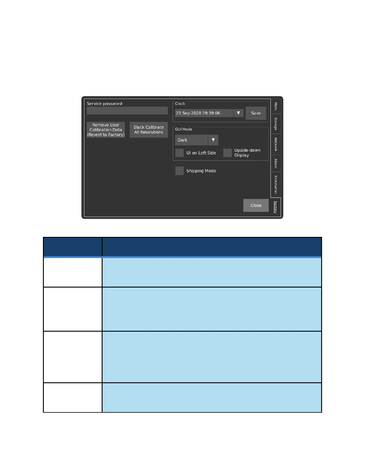 This tab contains functionality related to the manufacturing and factory calibration of the camera, as well