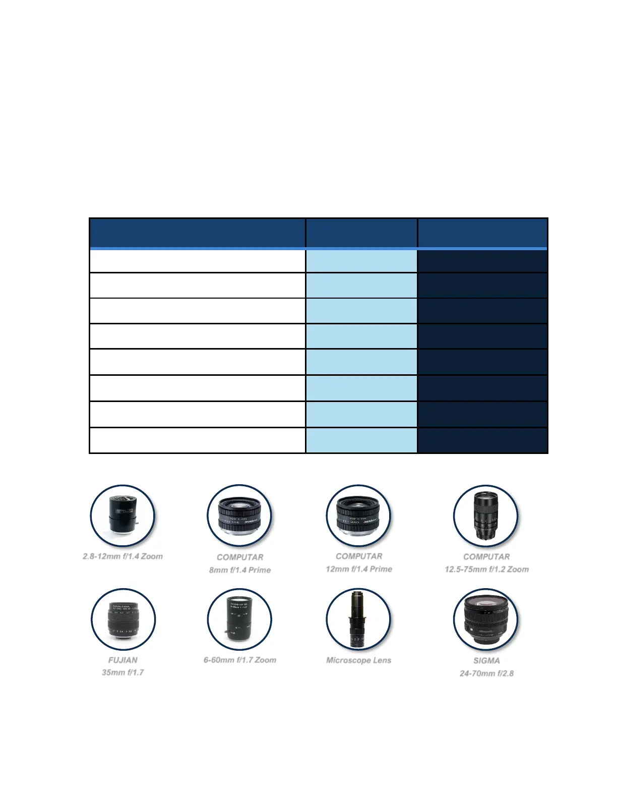 appropriate adapters to convert them to C mount. Common lenses available for the