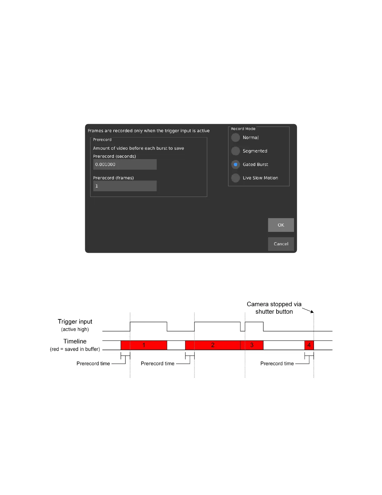 In Gated Burst mode, multiple videos are kept in memory. New video is recorded only while the trigger