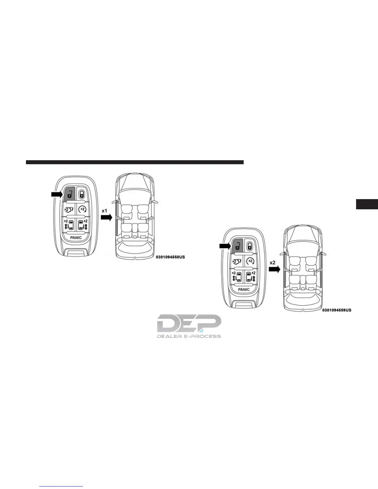 Fob twice within five seconds to unlock all doors and