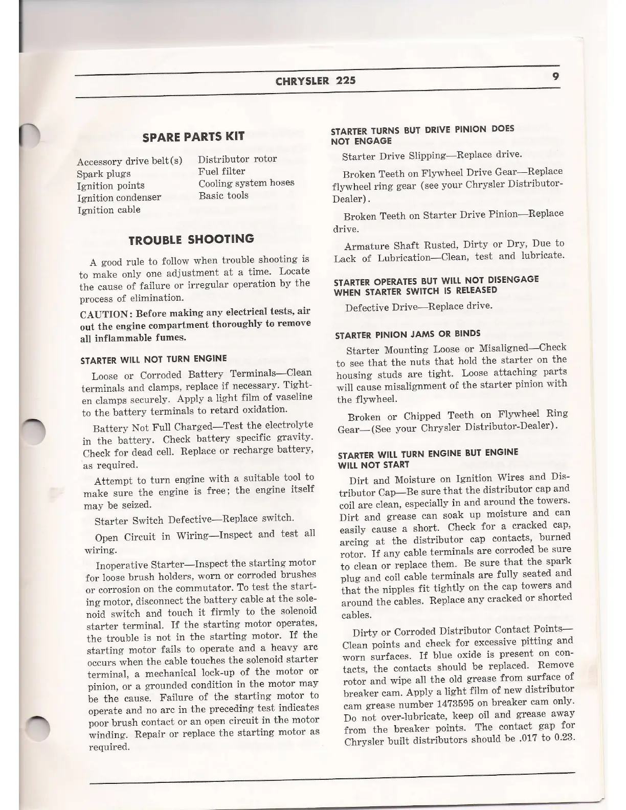 Chrysler 225 - TROUBLE SHOOTING; Starter Not Turning Engine; Starter Engages But Drive Pinion Does Not; Engine Not Starting