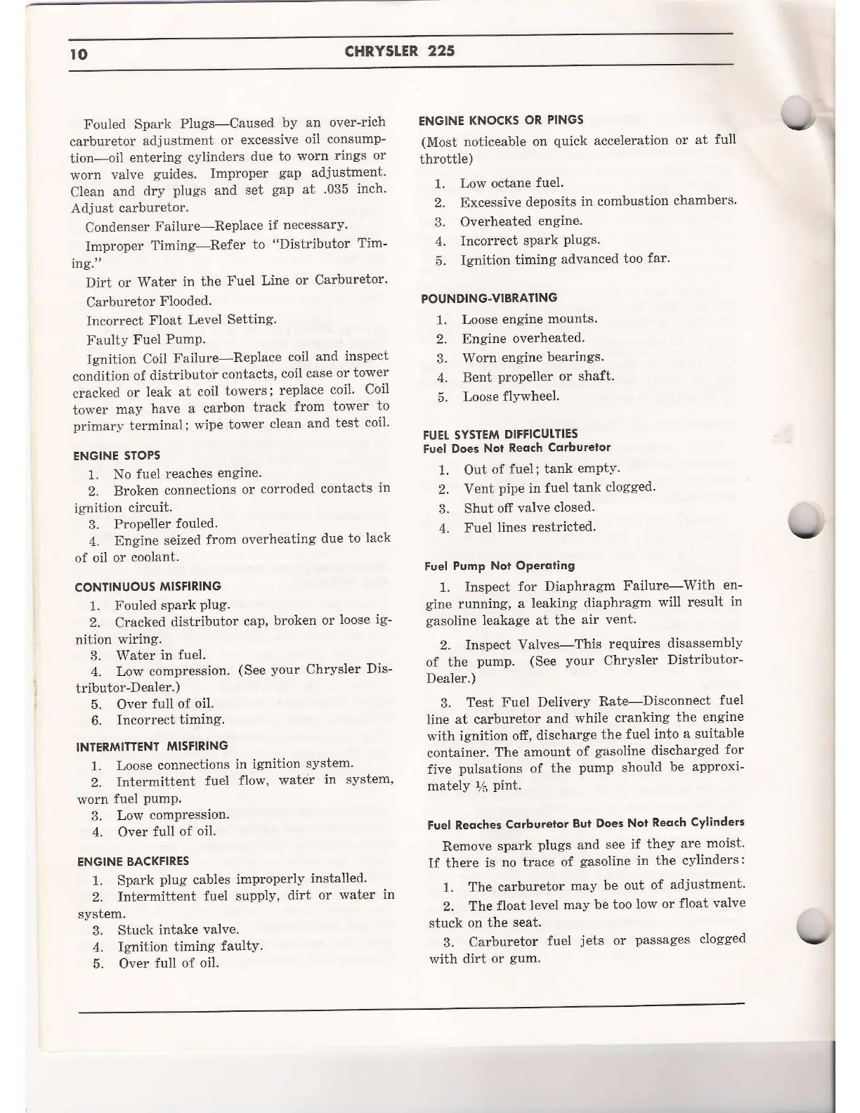 Chrysler 225 - TROUBLE SHOOTING (Continued); Engine Stops and Misfiring Causes; Engine Knocks, Pings, Pounding, Vibrating; Fuel System Difficulties
