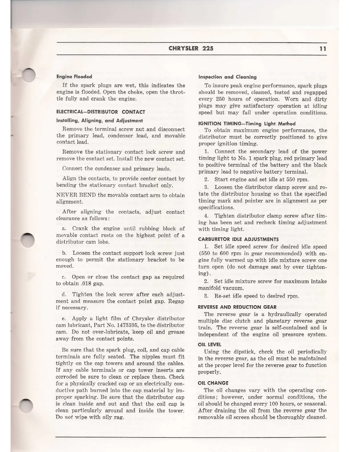 Chrysler 225 - ELECTRICAL-DISTRIBUTOR CONTACT; Contact Point Adjustment Procedure; Distributor Cap and Cable Inspection; IGNITION TIMING
