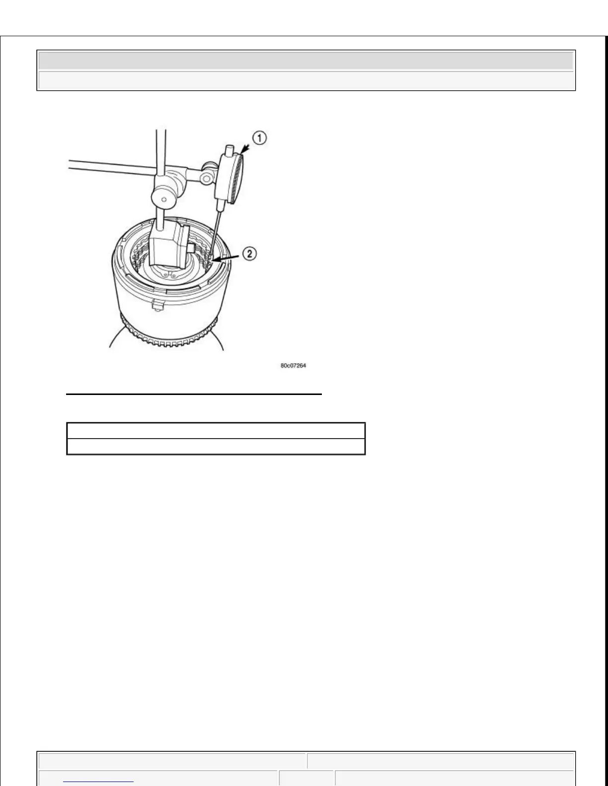 40. Set up a dial indicator (1) on the reverse clutch pack (2).