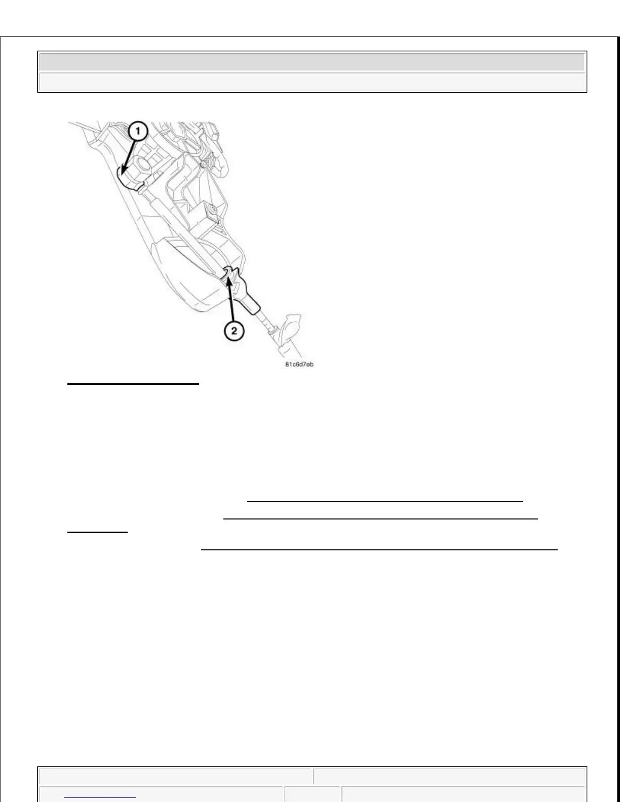 5. Install the gearshift cable (1) to the shifter. Make sure the lock tab (2) on the gearshift cable is fully
