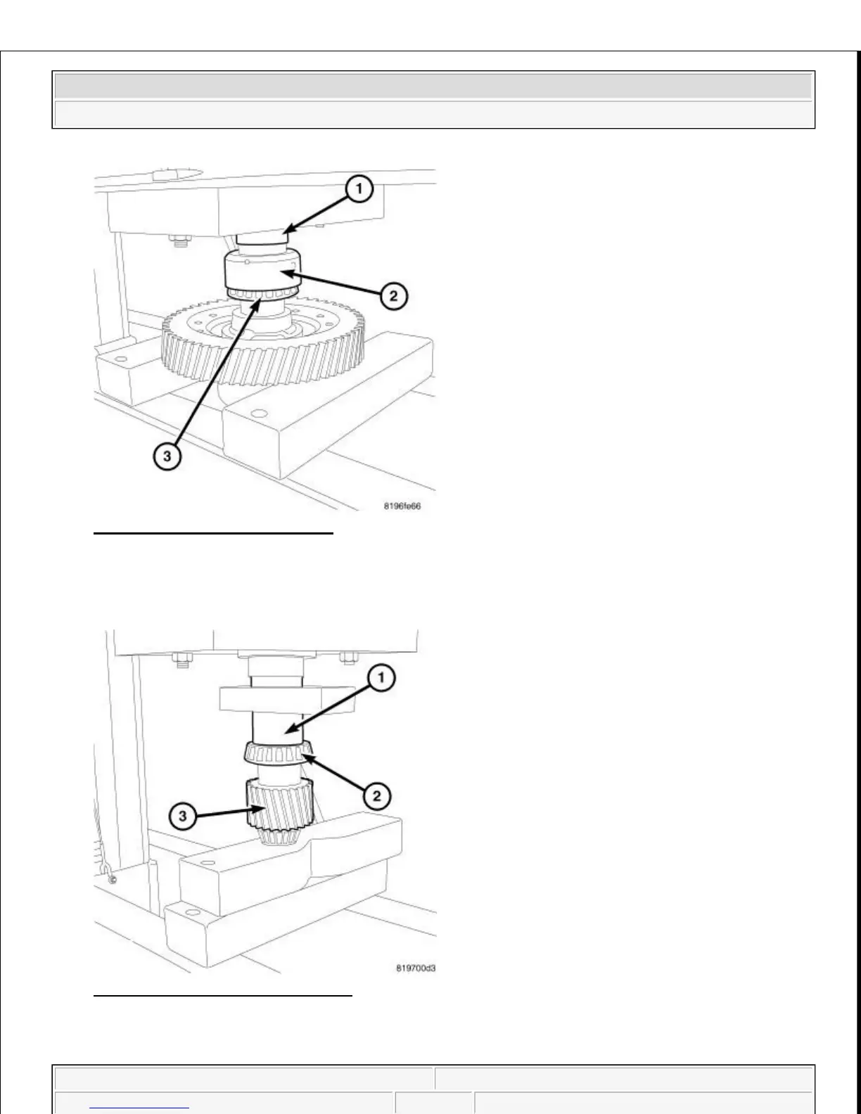12. Using Installer C-4213 (2) and a press (1), install differential bearing (3) to ring gear side of the