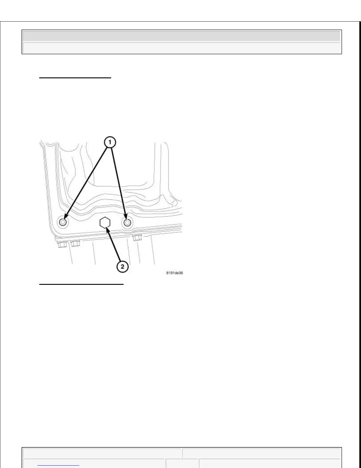 18. Remove the pressure tap plug (2) at valve body oil pan.