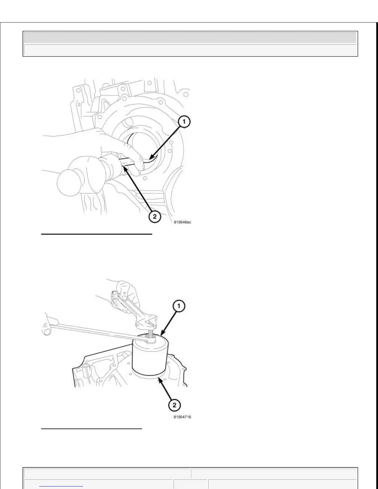 66. Using a hammer and suitable drift (2), drive out inner output bearing cup (1).