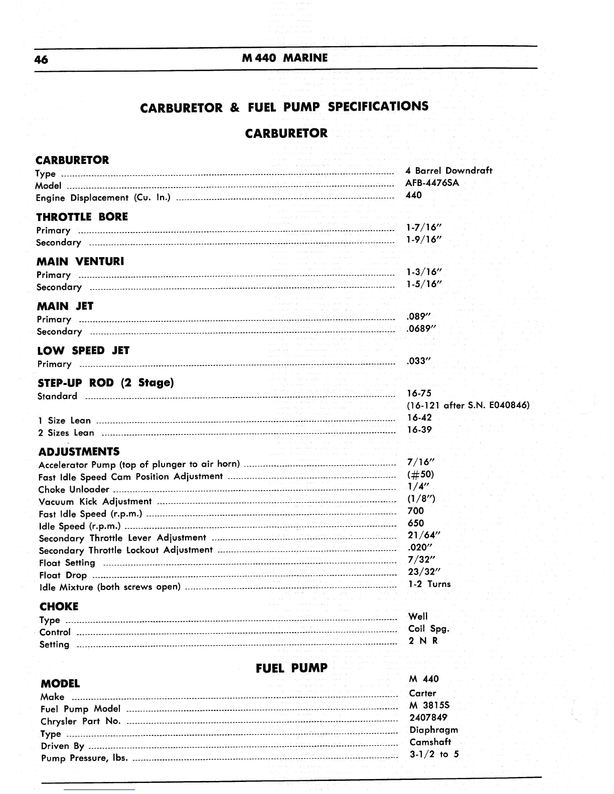 Chrysler M440 - Carburetor & Fuel Pump Specifications