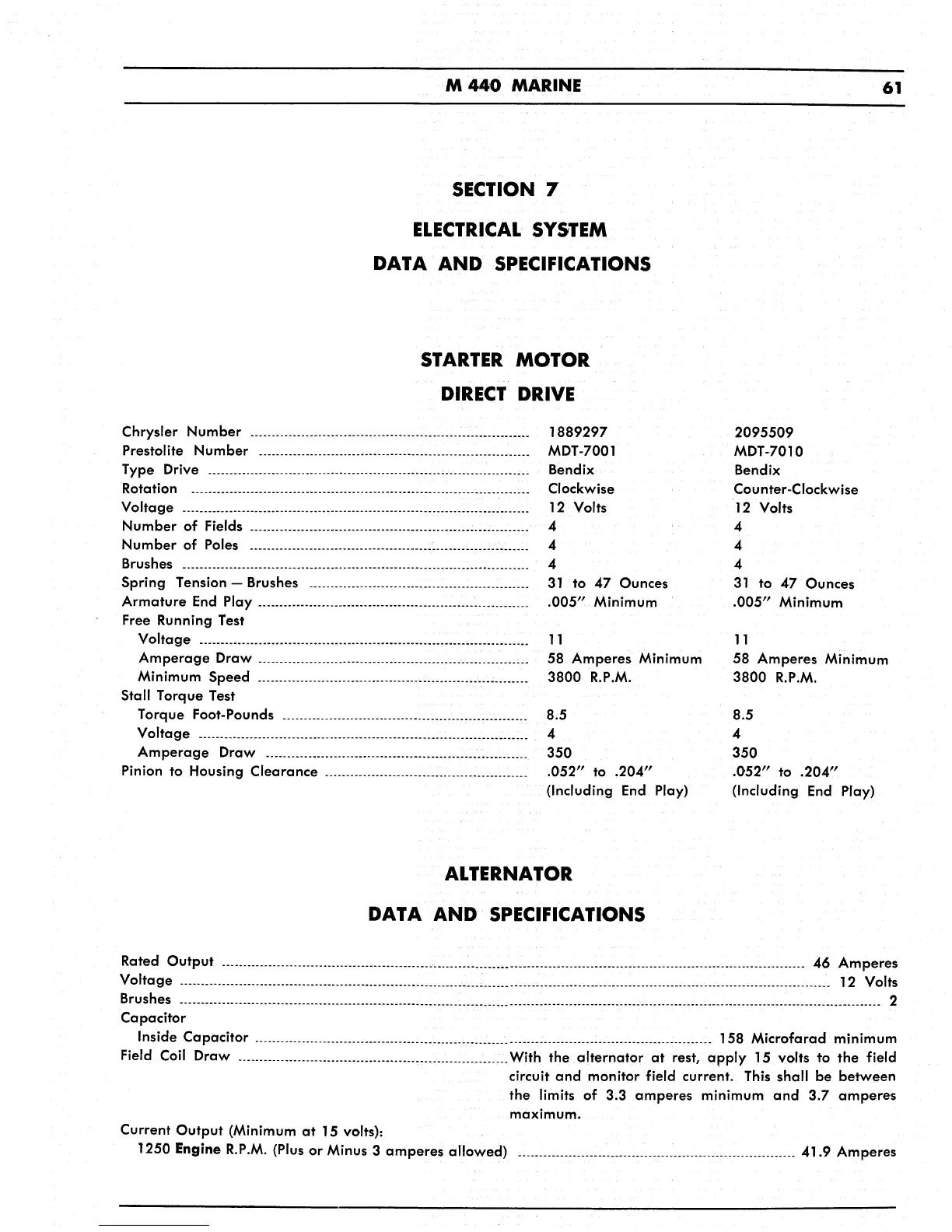 Chrysler M440 - Electrical System Data and Specifications; Alternator Data and Specifications