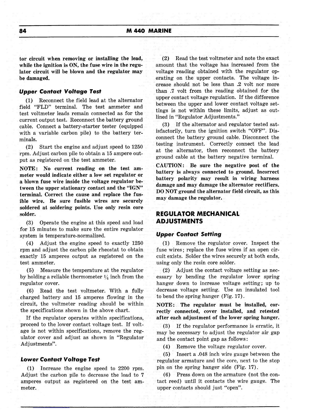 Chrysler M440 - Regulator Mechanical Adjustments; Upper Contact Voltage Test; Lower Contact Voltage Test; Upper Contact Setting