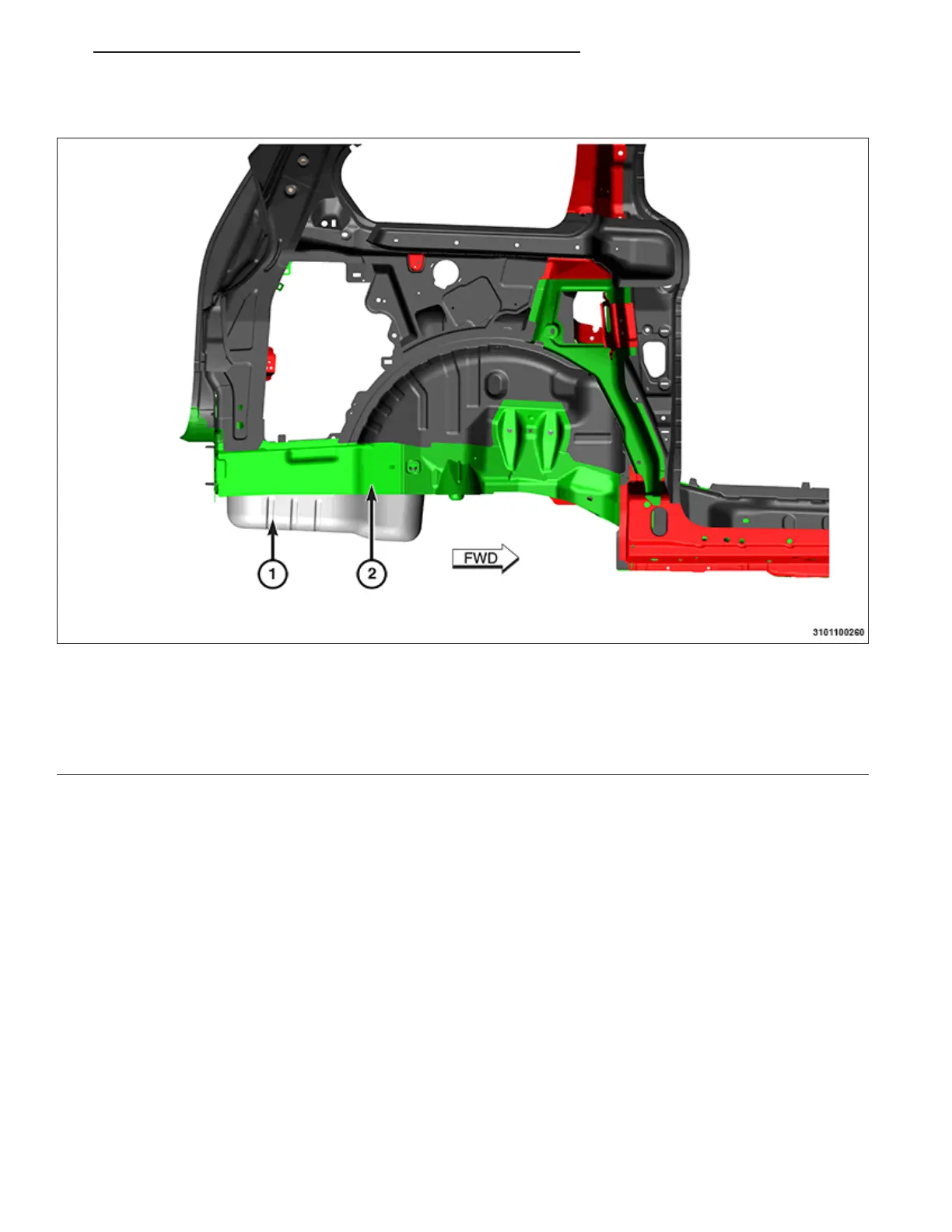 Remove the 3rd row seat tub assembly (1) and the rear rail cover (2).