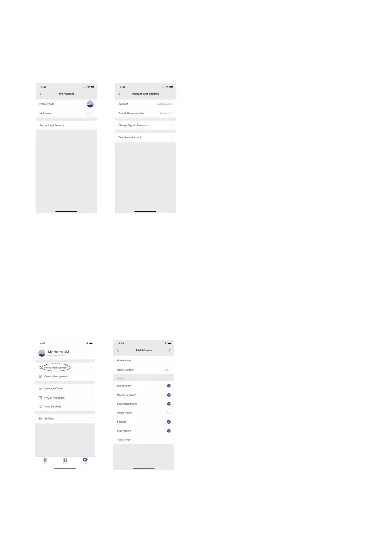 Tap [Me] on the main page and tap [Home Management] to add home name, home