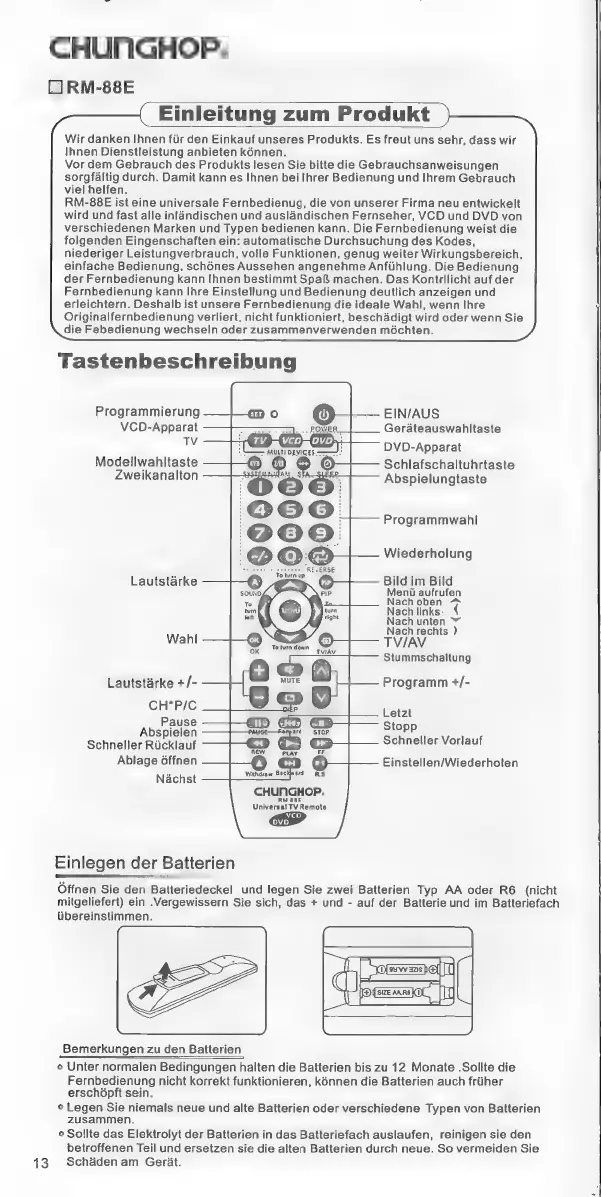 Chunghop RM-88E - Einlegen der Batterien