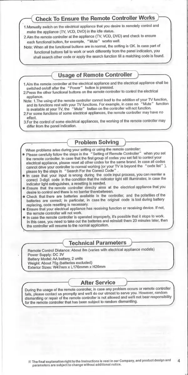 Chunghop RM-88E - Verifying Remote Operation; Remote Controller Usage; Troubleshooting and Problem Solving; Technical Specifications and Support