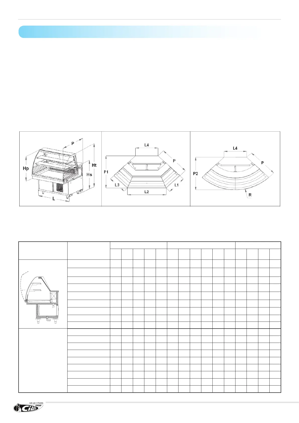 Ht=total height – P=depth display cabinet – L=length display cabinet – P1=depth shaped display cabinet – L4=length rear side