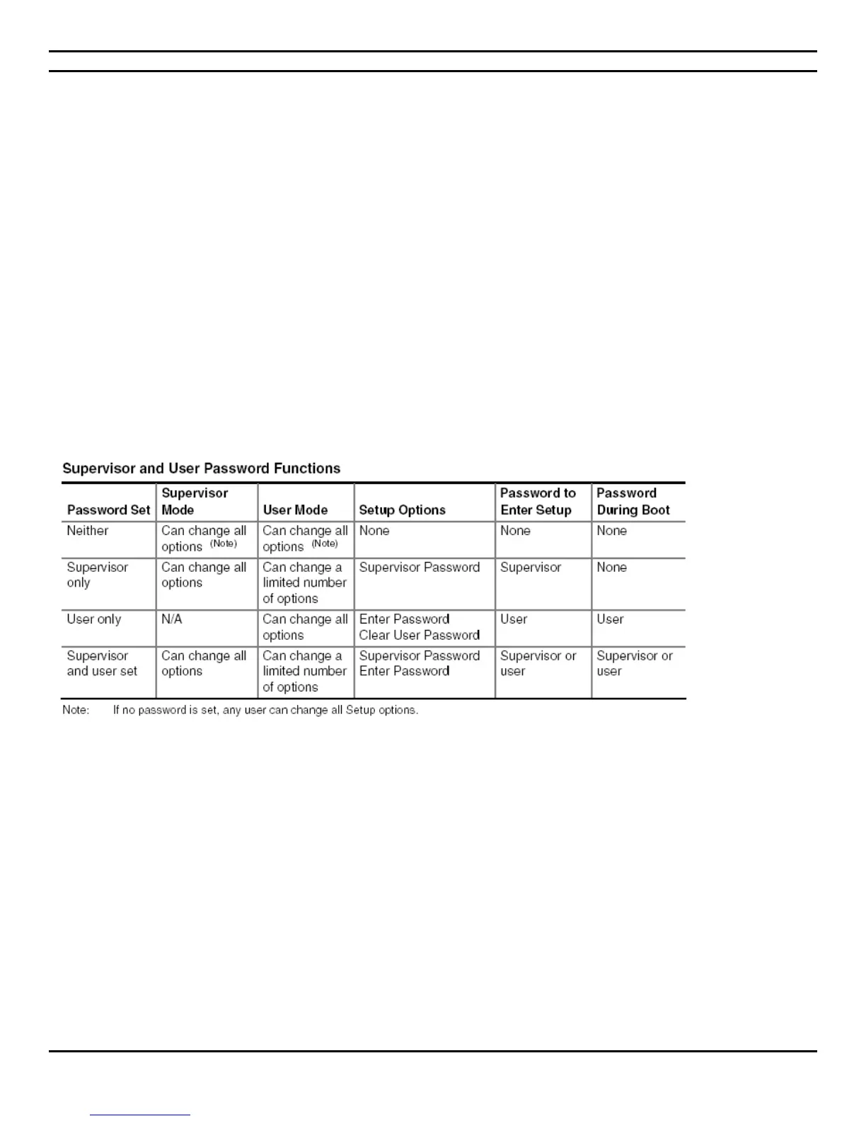 The following table shows the effects of setting the supervisor password and user password. This table is for reference only and is not