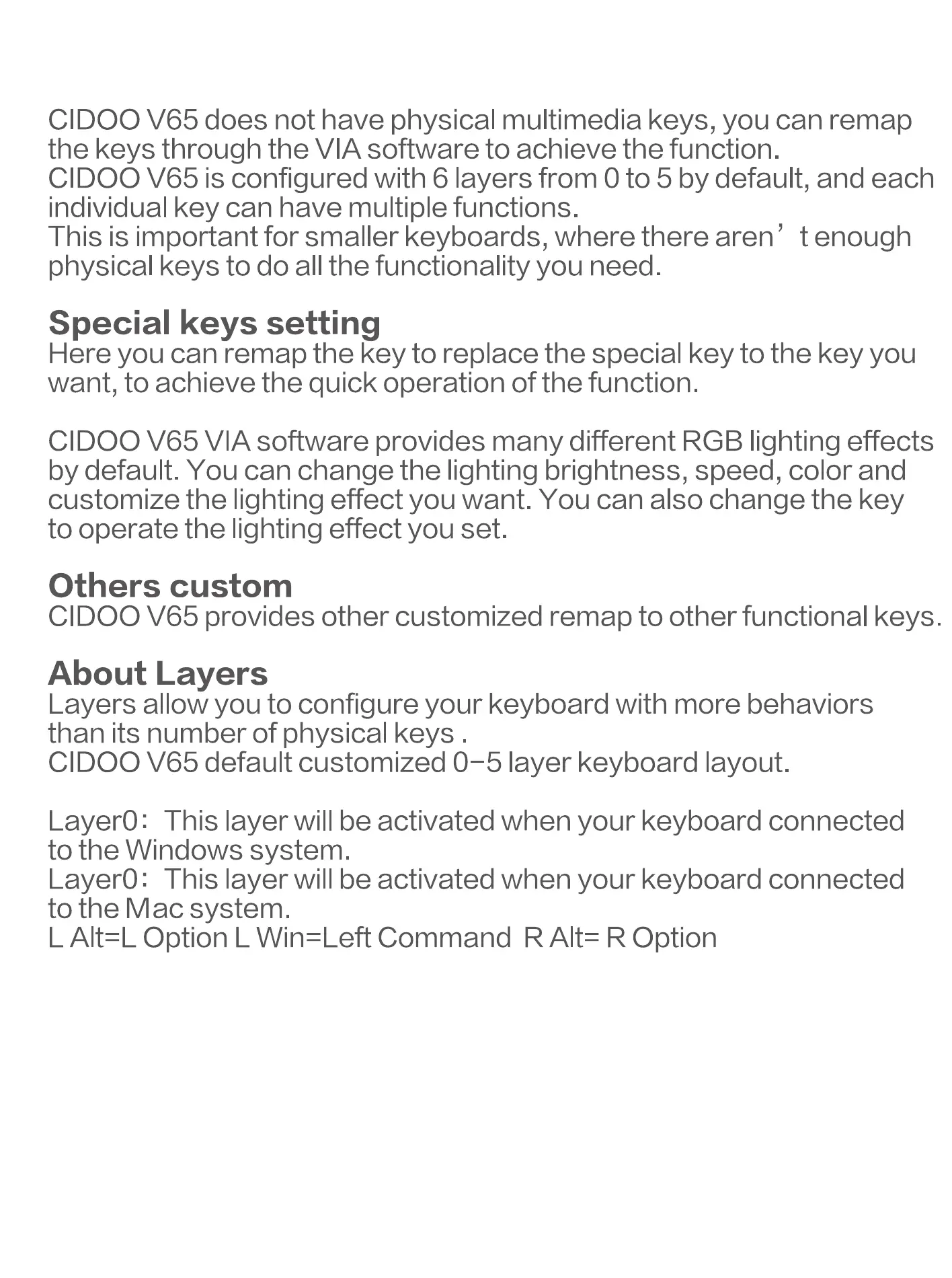 CIDOO V65 provides other customized remap to other functional keys.