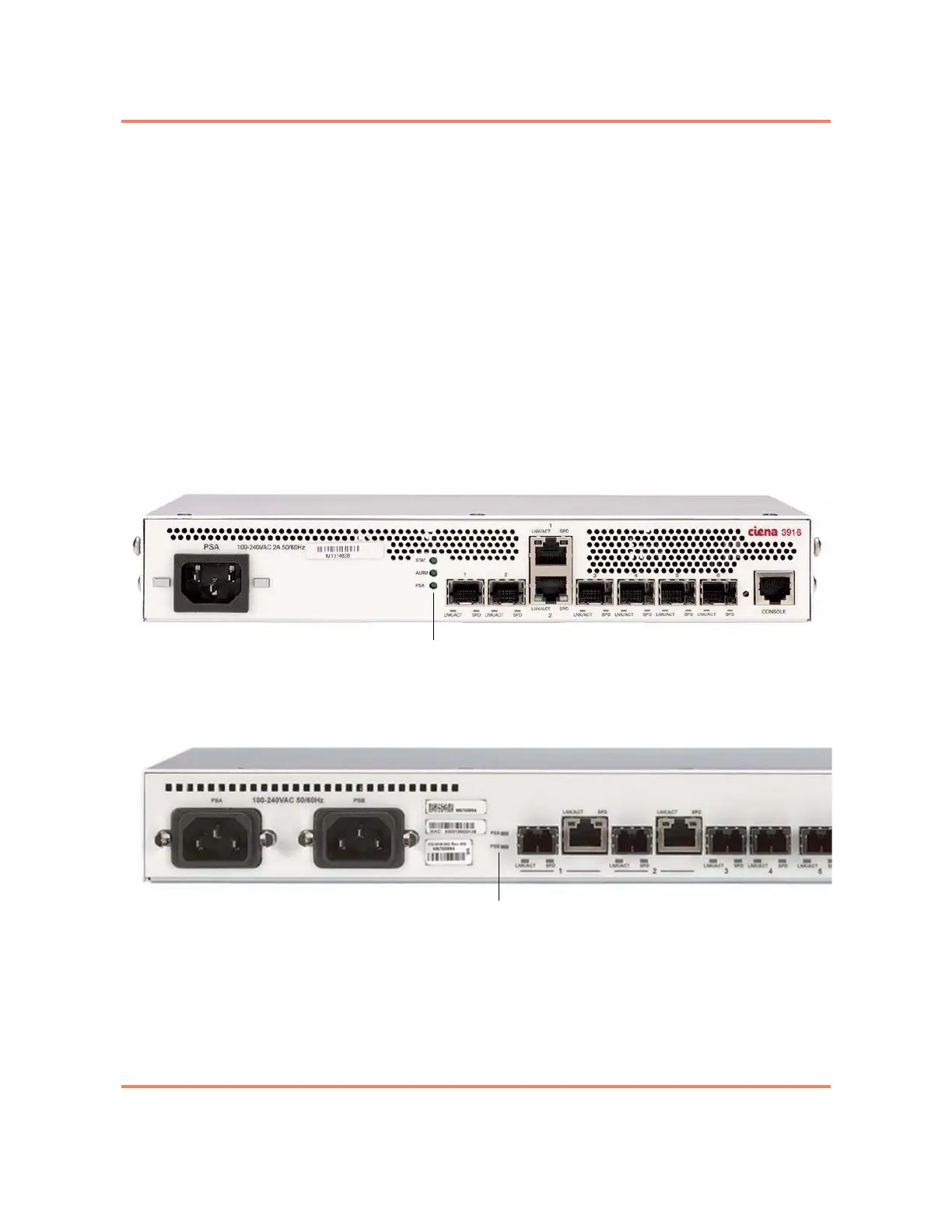 • 3916 Dual AC Mini — two power LEDs labeled PSA and PSB. See Figure