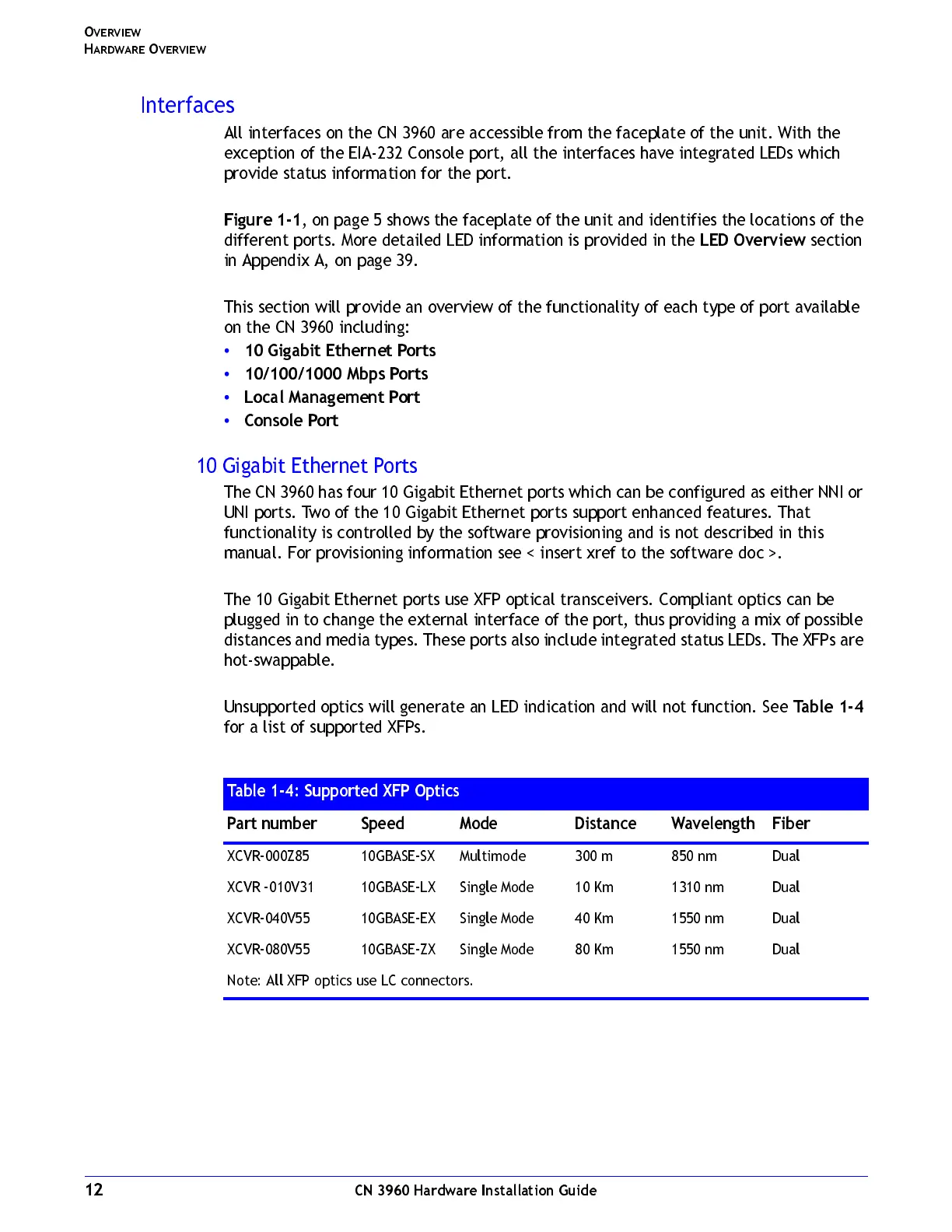 Table 1-4: Supported XFP Optics