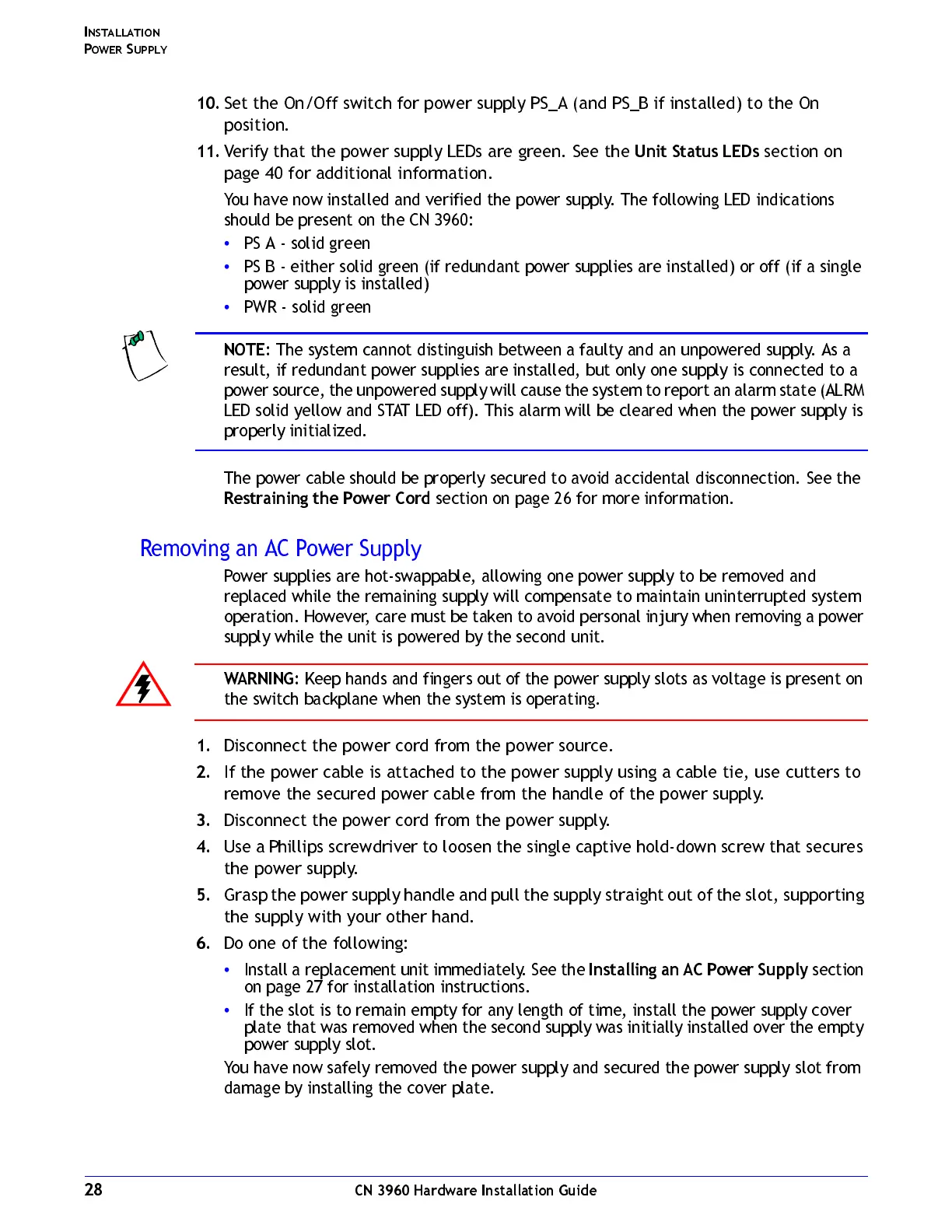 LED solid yellow and STAT LED off). This alarm will be cleared when the power supply is