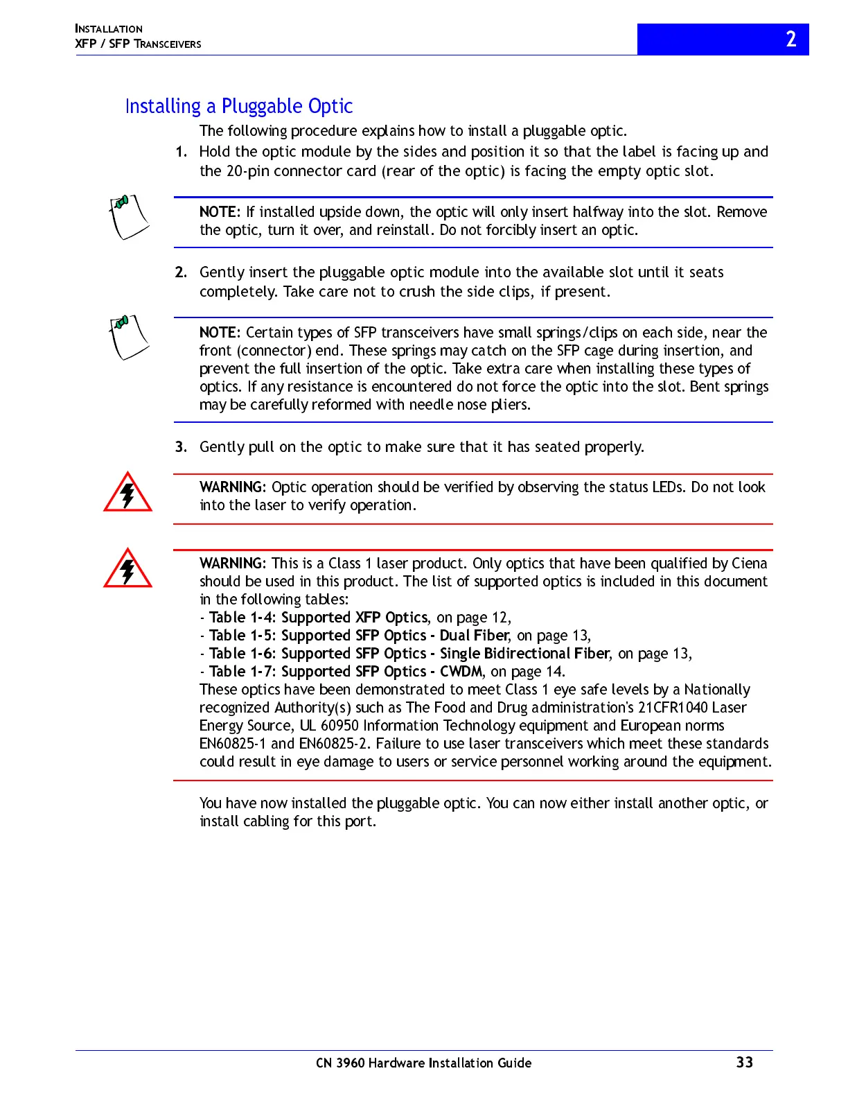 This is a Class 1 laser product. Only optics that have been qualified by Ciena