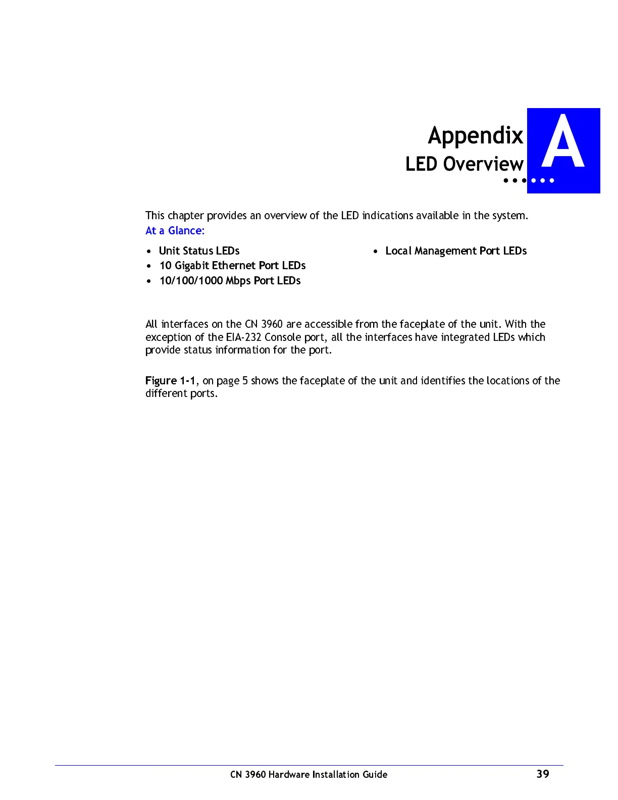 All interfaces on the CN 3960 are accessible from the faceplate of the unit. With the