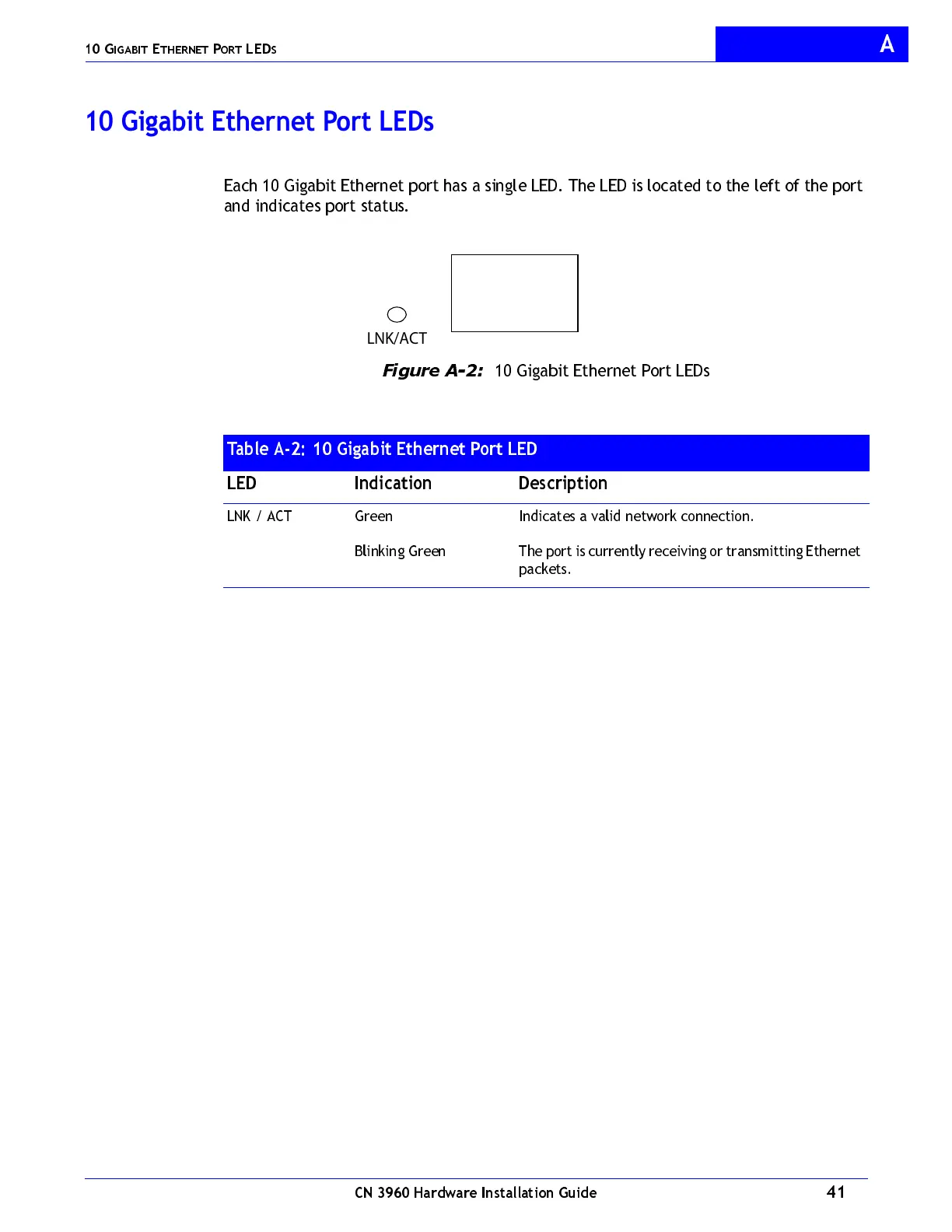 Table A-2: 10 Gigabit Ethernet Port LED