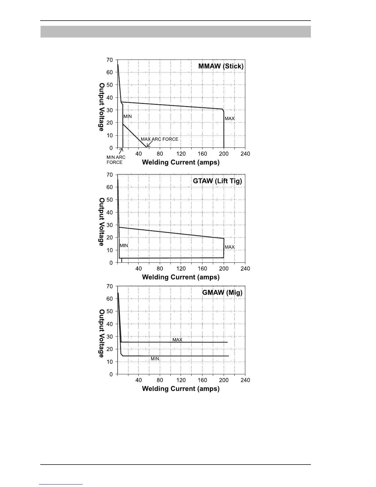 Voltage-Amperage Curves shows maximum voltage and amperage output capabilities of welding power source.