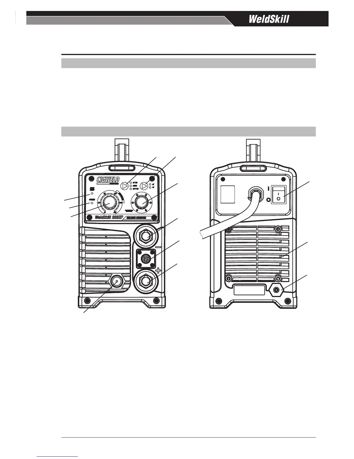 The amperage control knob adjusts the amount of welding current delivered by the power source. The am-