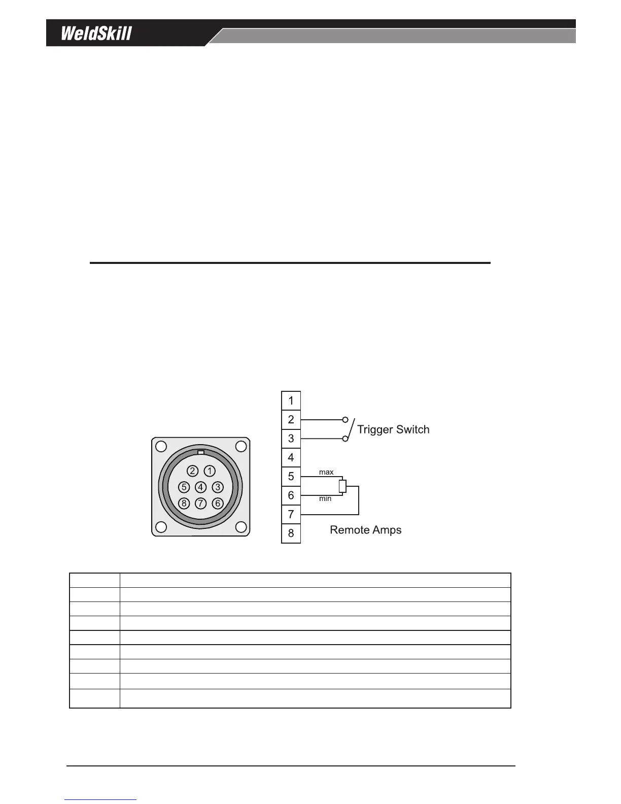 The 8 pin socket on the power source is used to connect a trigger switch or remote control device i.e foot