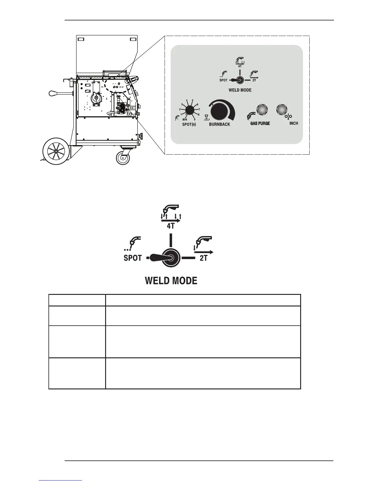 The Weld Mode Selector switch selects the method of welding mode.