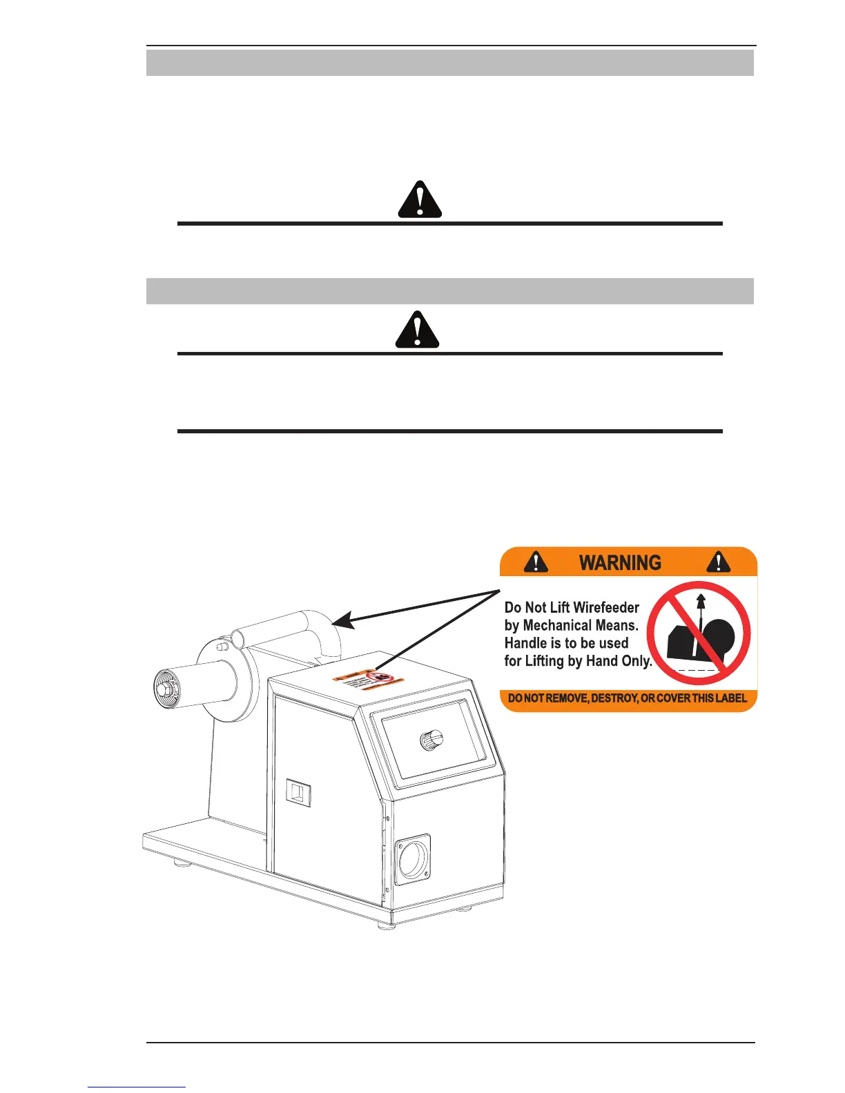 DO NOT lift the WELDSKILL 4R Wirefeeder by the Handle using mechanical means. The WELD
