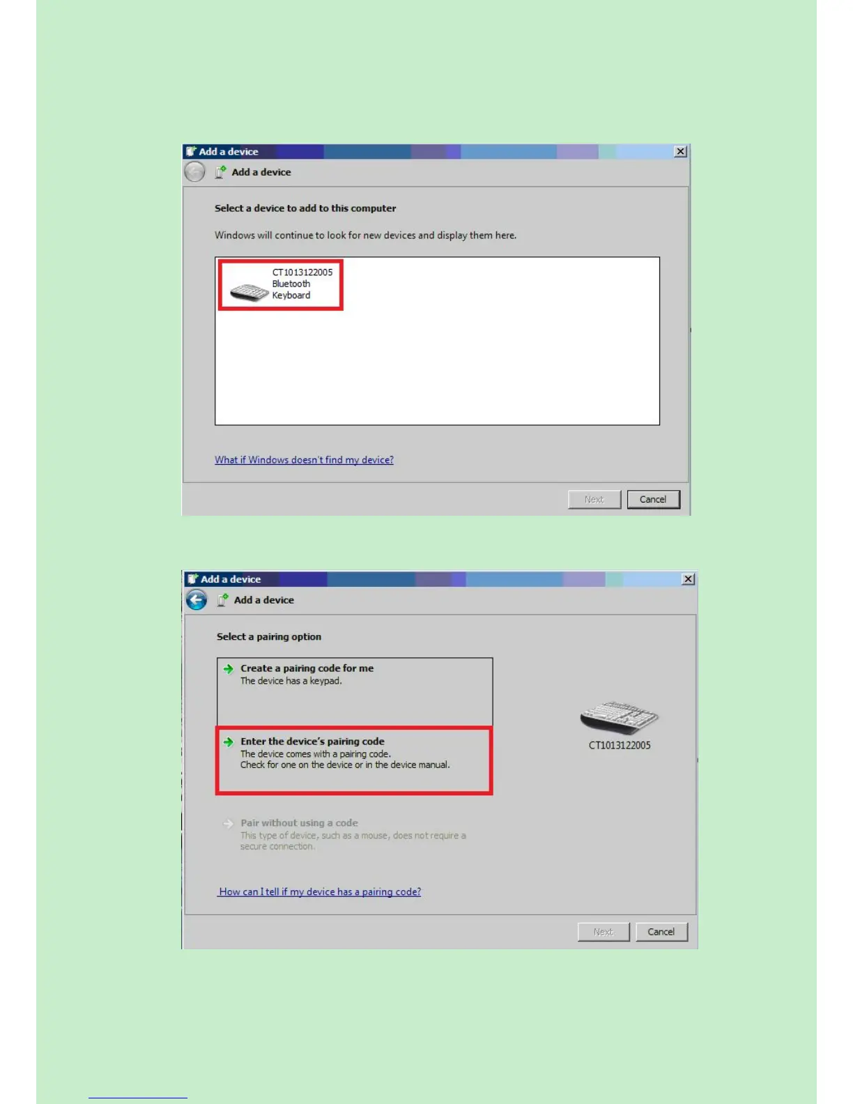 Select ‘Enter the device’s pairing code’, and click ‘Next’.