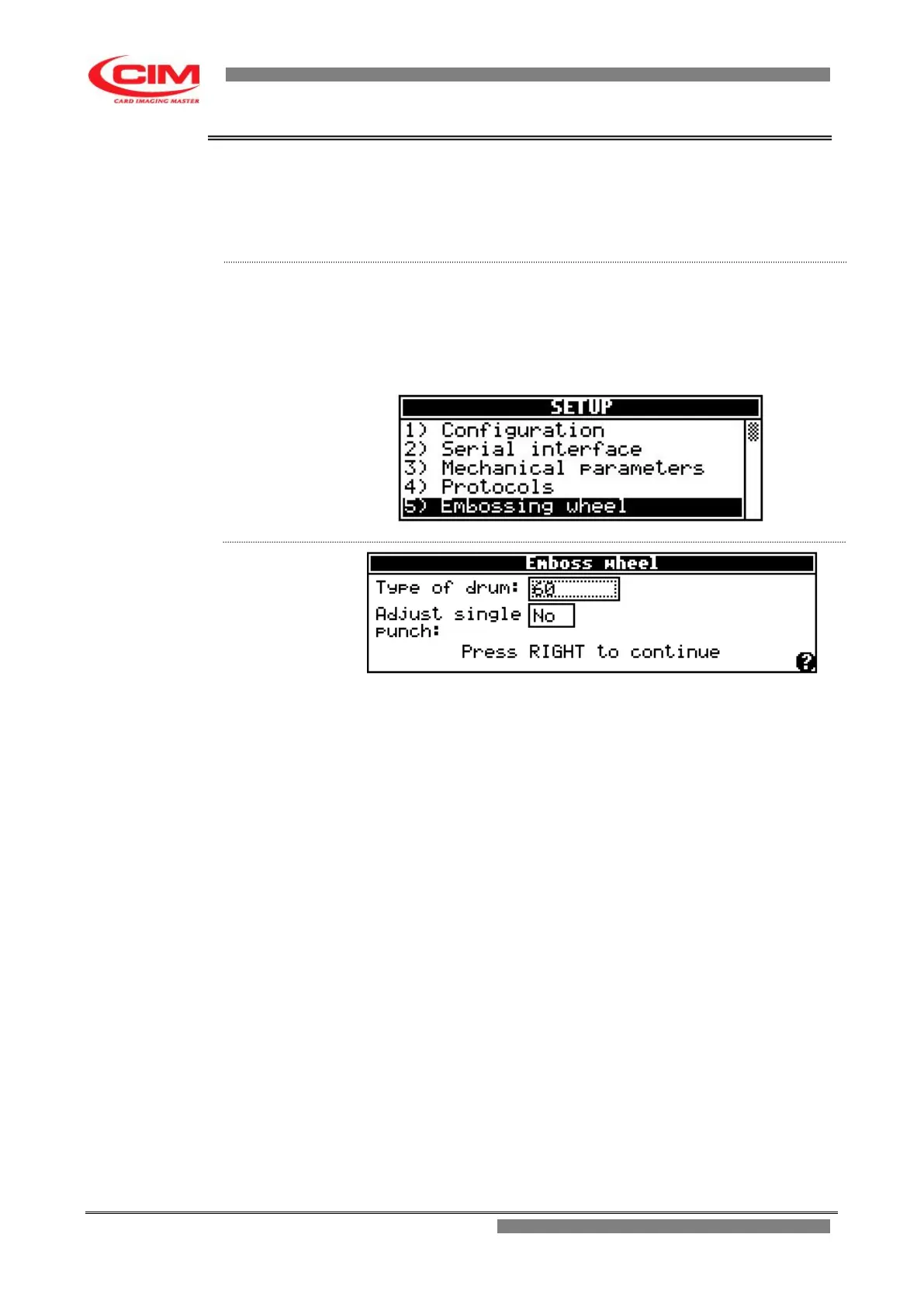 From the “SETUP” menu you can access the Embossing Wheel function by